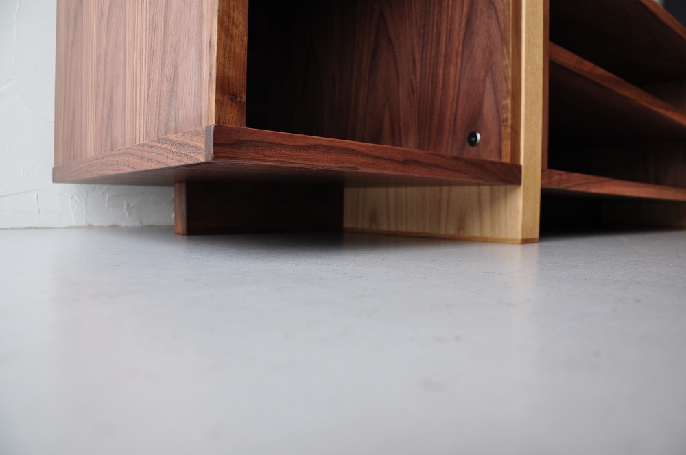浮いたように見える脚。耐久性ももつように補強を入れていますが、低い所にあるので目立ちません。このように下が開いていると、配線の時に有利だったりします。