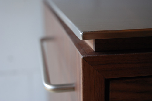 ステンレス天板の厚みは8mm。手が触れる部分は全て磨き、お子さんが触っても痛くないように加工しています。R1mmくらいに丸くしているのが分かりますでしょうか。また、ステンレスの厚みはもっと薄くも、厚くもすることができます。