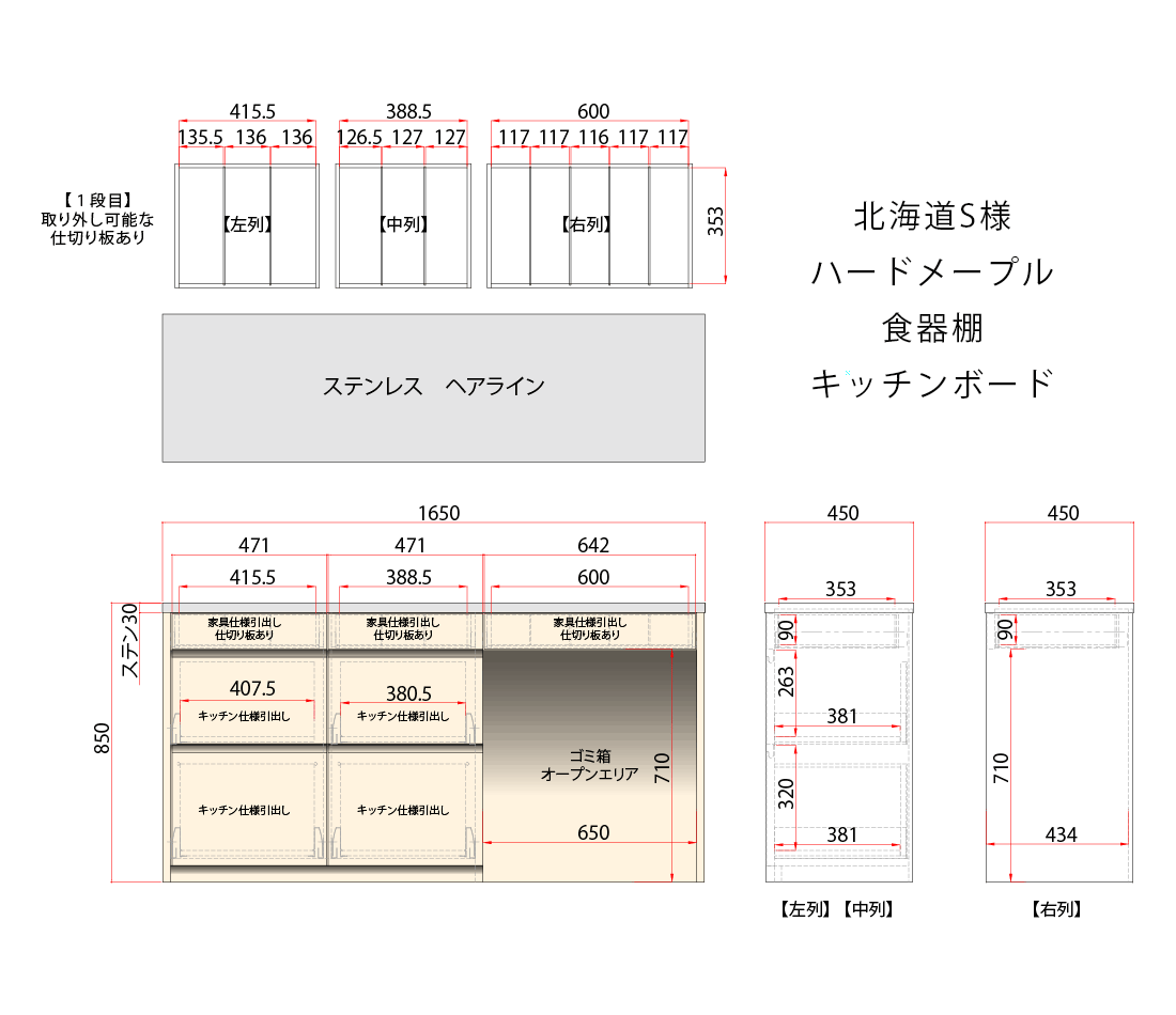 大きなゴミ箱オープンエリアのある幅1650mmのキッチンボードです。