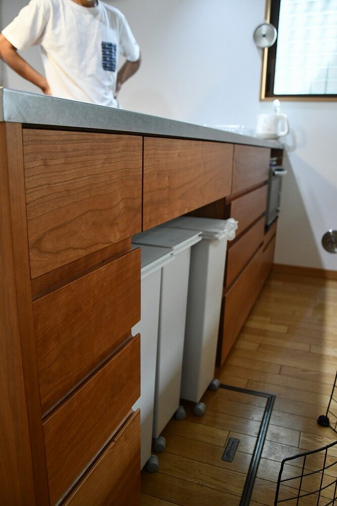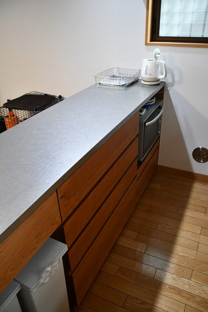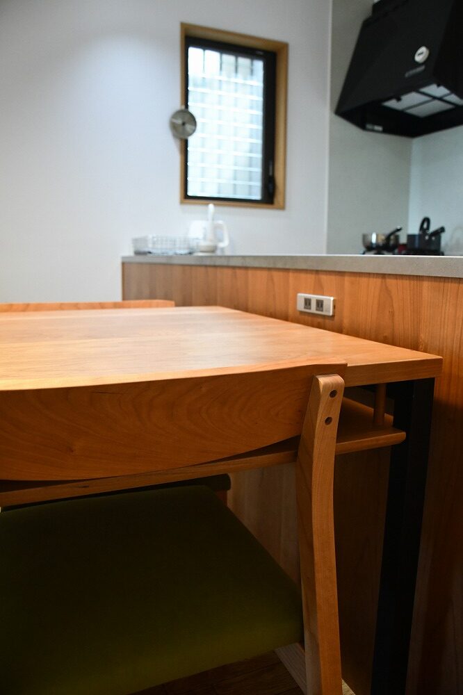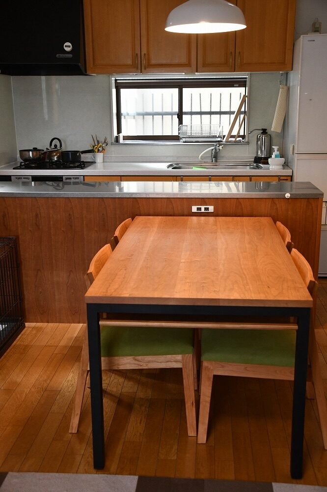 東京都W様ありがとうございます。壁付けキッチンのあるキッチンダイニング。ペニンシュラカウンターとダイニングテーブルセットがですが、同じブラックチェリーの木でできた家具があると統一感があってプチリフォームした感じにまとまります。もともとあったコンセントをフルで生かして、家電もゴミ箱も使いやすい位置に配置。こちらのアイテムは