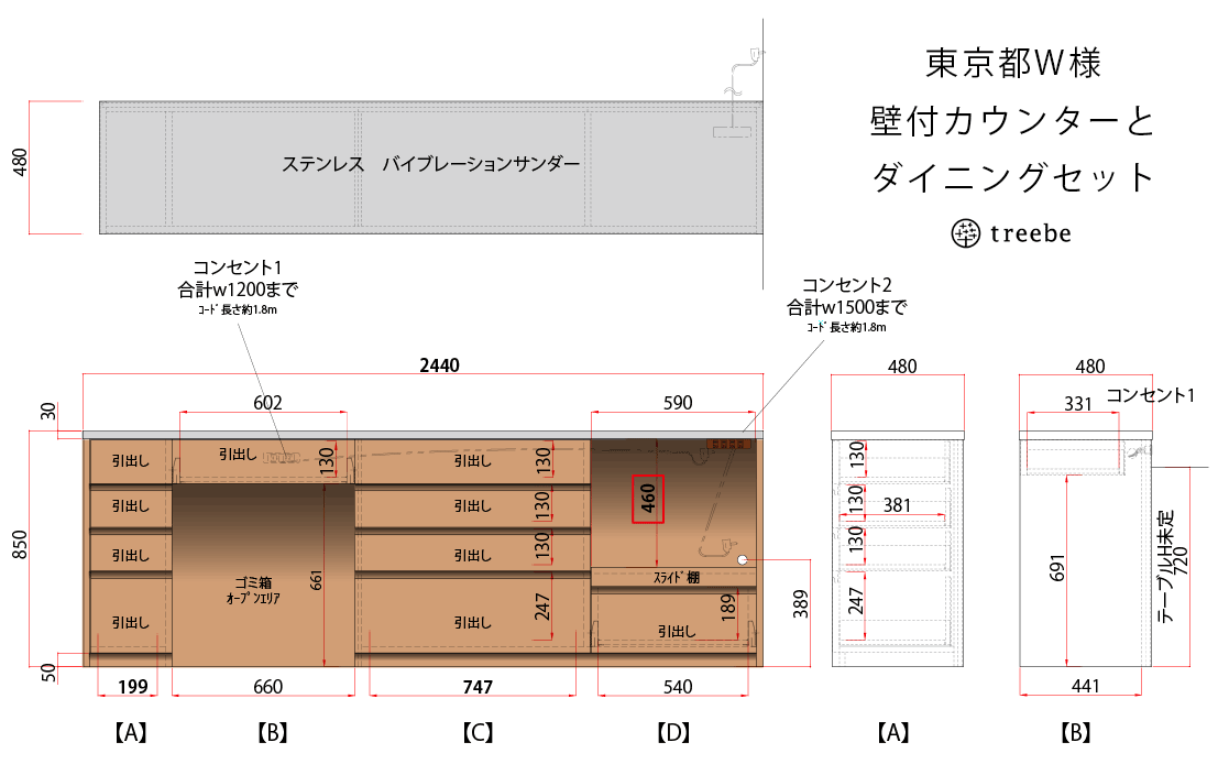 壁付けカウンター:700,000円ダイニングテーブルセット:500,000円製作費別途